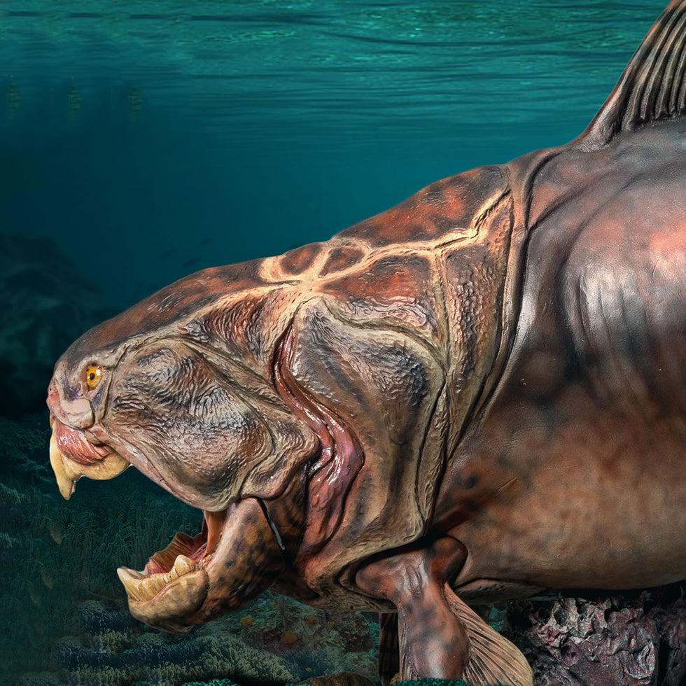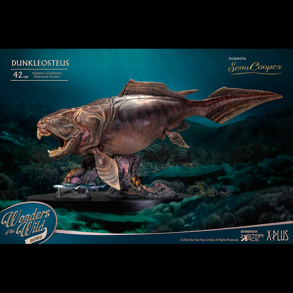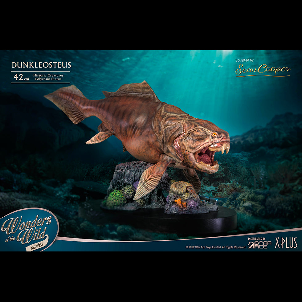 Star Ace’s “Wonders of the Wild” series brings collectors the Dunkleosteus, the largest fish of the Devonian period. Living 382-358 million years ago, this fish was armored and without teeth, just a jaw of armored plates forming a blade that could cut through anything with more jaw force than any other creature of the time. Growing to almost 9 meters long and over 3.6 tonnes, the Dunkleosteus was an alpha predator, fearing nothing except other Dunkleosteus.