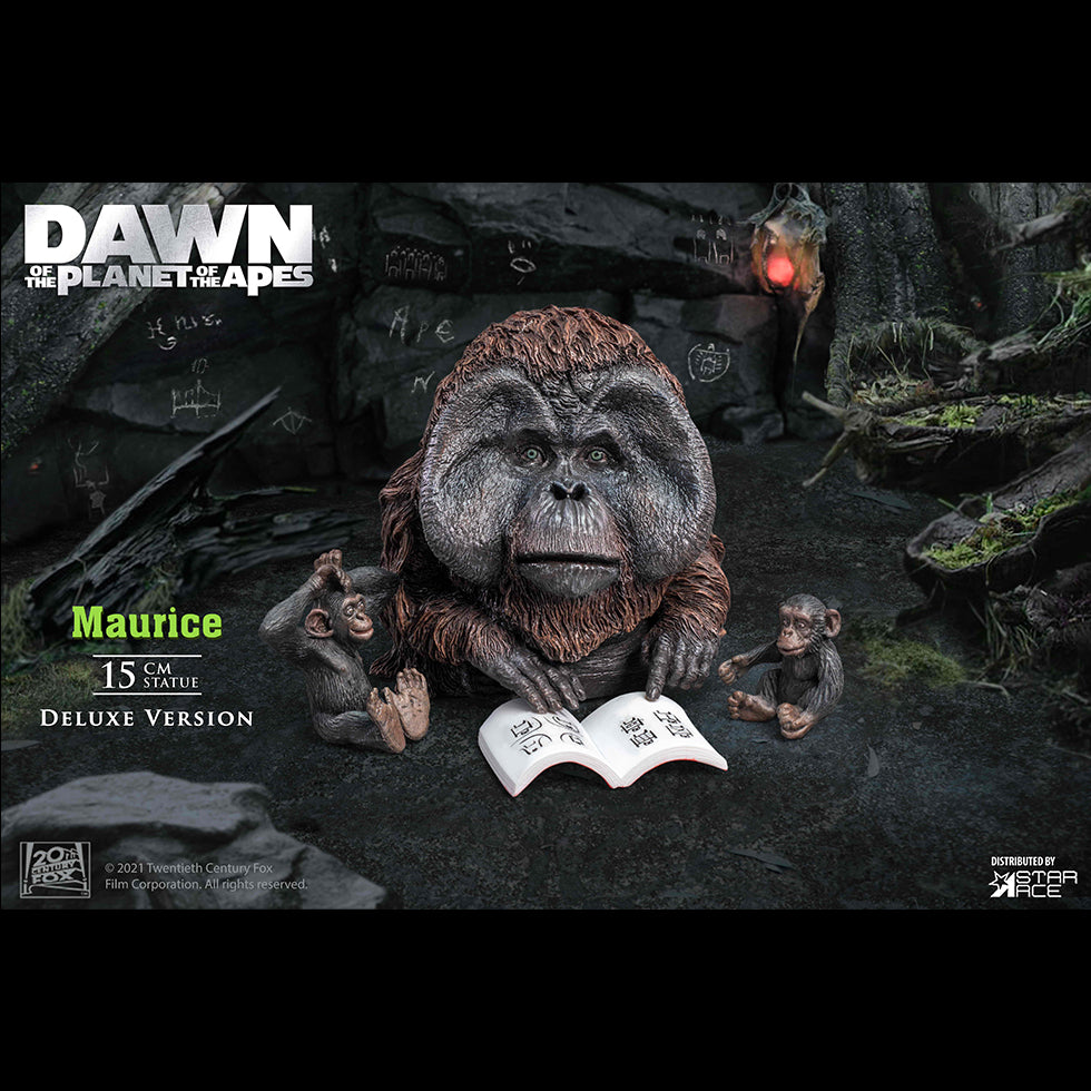 Continuing the successful line of Defo Real figures from Dawn of the Planet of the Apes, comes the intelligent Orangutan Maurice. Maurice was smart before the virus and this Defo Real figure depicts him with a book in front of him. The Deluxe version includes two young apes, and Maurice can be displayed as a teacher for these baby chimps.