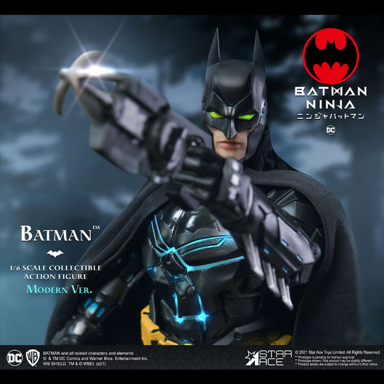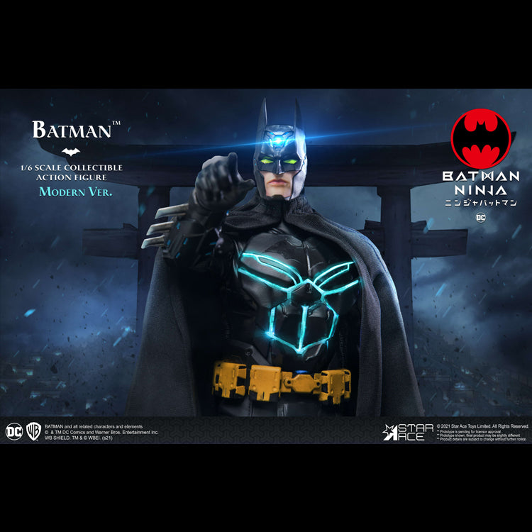 This new 1/6 figure from Batman Ninja features the modern Batman before he must abandon technology. This high-tech Batman has light up eyes and removeable cowl piece to show lights beneath. The body armor also lights up blue. He comes with a batarang and a grappling gun.