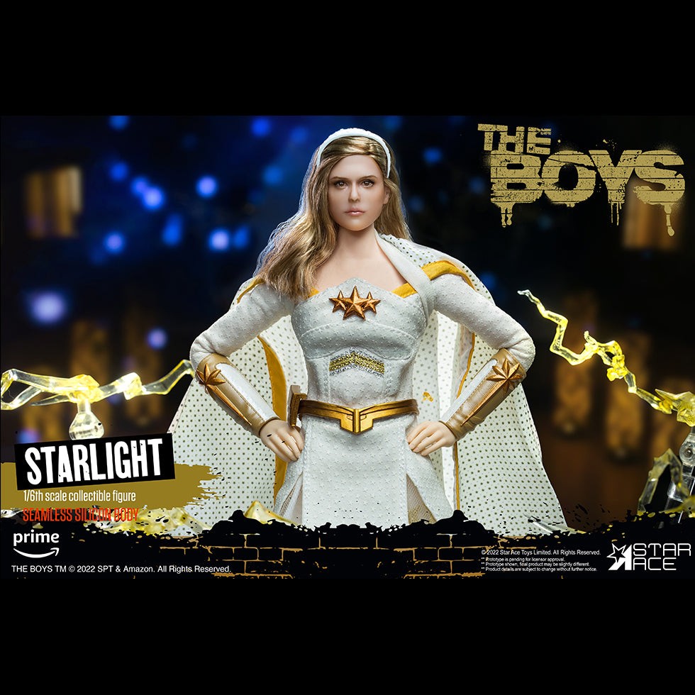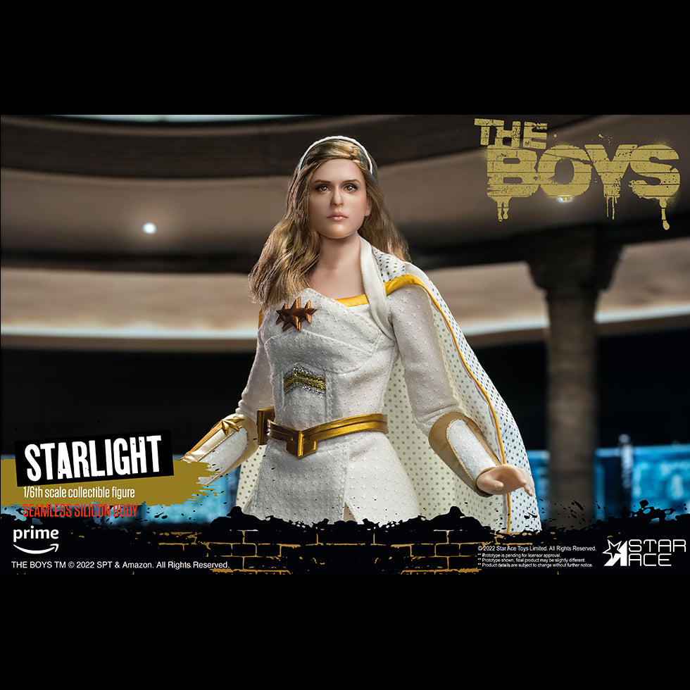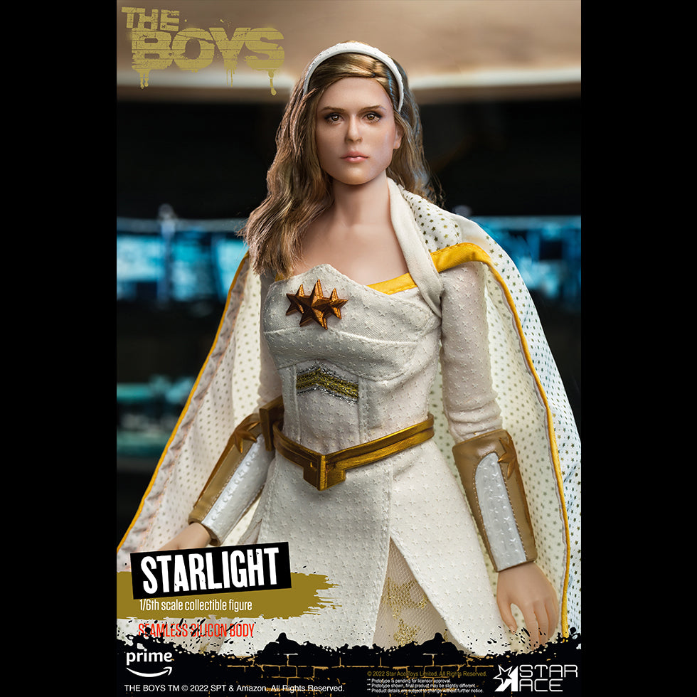 This 1/6th scale figure of Starlight features a seamless body and has over 30 points of articulation. The headsculpt features an officially approved authentic likeness of Erin Moriarty as Starlight with light-up eyes and rooted hair. She is wearing a detailed costume with cape and an accurately styled emblem, bracers, belt, and boots.